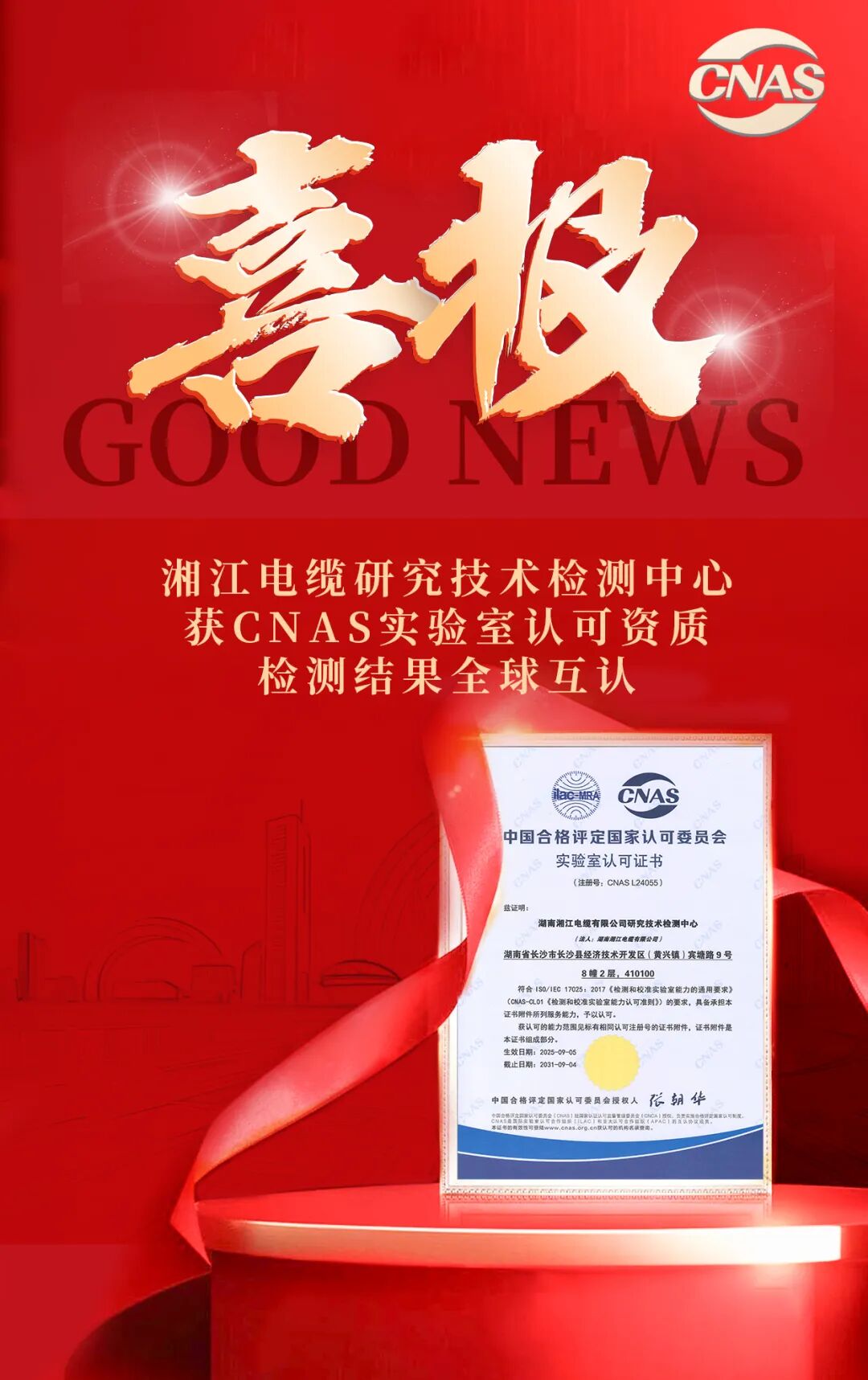 近日,湘江电缆迎来一个里程碑式的重要时刻——公司“研究技术检测中心”正式通过中国合格评定国家认可委员会(CNAS)的评审,成功获得CNAS国家实验室认可证书!(注册号:CNAS L24055)